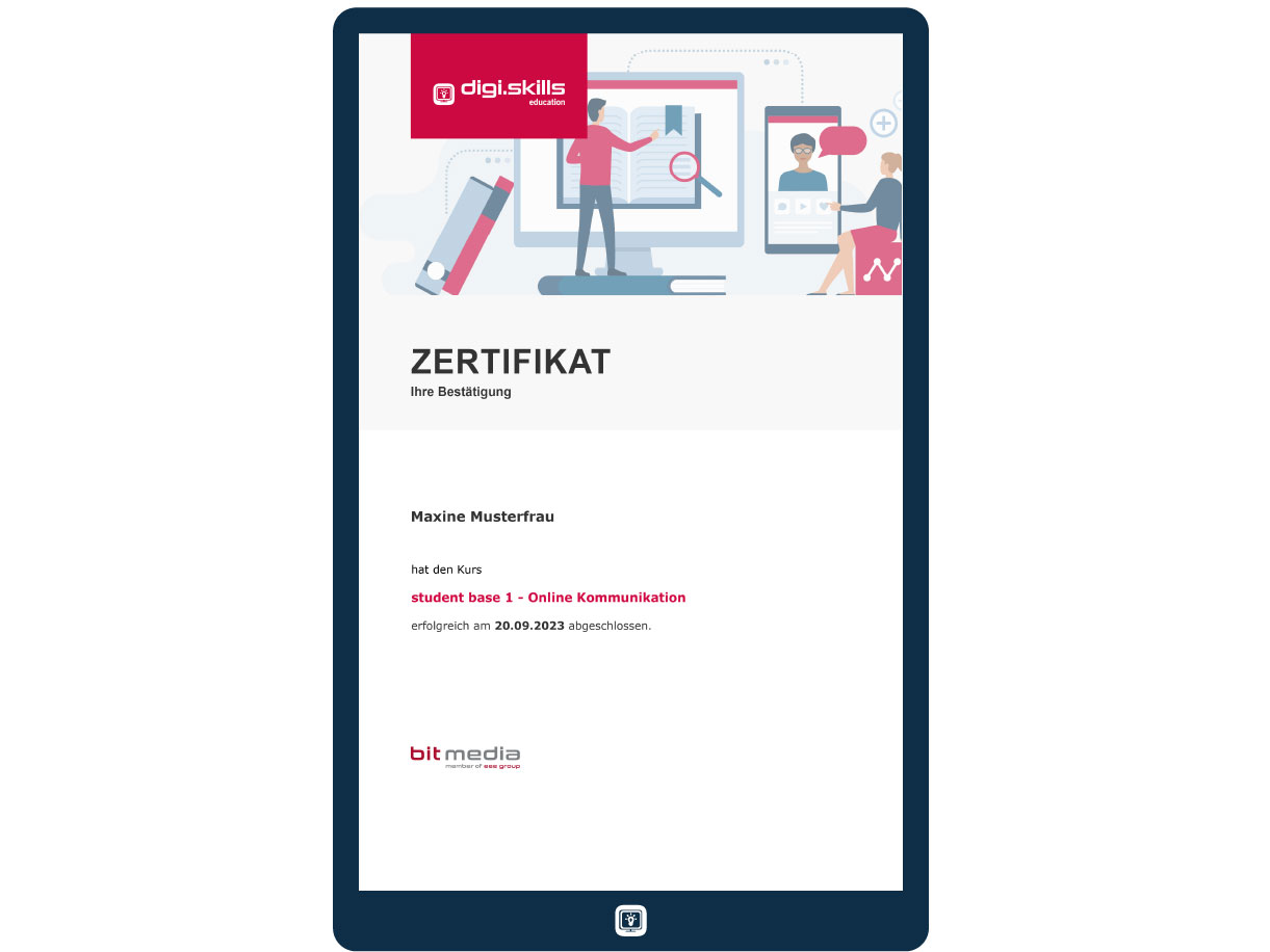 Nach Abschluss einzelner Kurse bzw. der gesamten Kursreihe bekommen Lernende direkt über die digi.skills Lernumgebung ein persönliches Zertifikat ausgestellt.